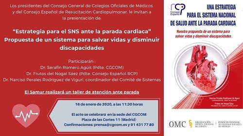 El Consejo General de Colegios Oficiales de Médicos (CGCOM) y el Consejo Español de Resucitación Cardiopulmonar (RCP) presentan, el jueves 16 de enero a las 11.30 horas, presentan una estrategia para el Sistema Nacional de Salud ante la parada cardiaca, un documento que recoge la propuesta de un sistema para salvar vidas y disminuir discapacidades