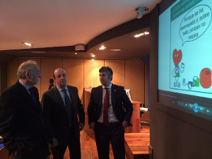 En primer lugar intervino el Dr. Cosme Naveda, que explicó que la campaña nace del compromiso que mantiene el Colegio de Médicos de Vizcaya con la ciudadanía, un compromiso que le lleva a poner en marcha acciones de educación y promoción de la salud. El Colegio de Médicos de Vizcaya ha creado un póster y un vídeo con dos personajes como protagonistas, Miren Bihotza y Jon Berpiztu, que enseñan a través de nueve sencillas viñetas, qué se debe hacer con una persona que ha sufrido una parada cardíaca hasta que llega la ayuda profesional. Se trata de enseñar a los chicos y chicas y ayudarles a perder el miedo a actuar si alguna vez se encuentran en un trance semejante. «Conocer esta técnica puede ayudar a salvar vidas», aseguró el Dr. Naveda. Este material se mandará por correo electrónico a todos los centros educativos de Vizcaya con el ofrecimiento de enviar un equipo de médicos coordinado por el propio Colegio, a aquellos centros que deseen reforzar la formación en RCP básica de forma presencial.