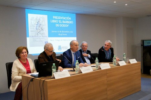 Antes de la inauguración de la exposición, las instalaciones de la sede colegial acogieron la presentación del libro ‘El Barbero de Godoy’. Su coautor es el Dr. Jaime Lloret, neurocirujano y profesor de Neuroanatomía en las universidades de Valencia, Autónoma de Madrid, Alicante y Elche, y Premio Nacional de Neurocirugía Vascular de la Sociedad Española de Neurocirugía. Estuvo acompañado por el coordinador de la obra, Manuel Avilés; por el vicepresidente del Ateneo Cultural, Dr. Francisco Mas y Magro, por la presidenta del Comité Asesor-Ateneo Cultural, Dra. Rosa Ballester, además de los doctores Schwarz y Lobato.