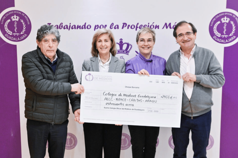 Un año más, el Colegio de Médicos de Guadalajara ha destinado el 0,7% de sus presupuestos (2400€) a fines relacionados con la salud y el bienestar de la población. Los beneficiarios de esta donación, que se viene realizando desde hace más de 15 años, han sido en esta ocasión la Fundación Nipace, la Asociación Española Contra el Cáncer de Guadalajara, la Asociación de Familiares de Enfermos de Alzheimer (AFAGU) y la Cáritas Diocesana Sigüenza Guadalajara. Cada una de las cuatro asociaciones ha recibido la cantidad de 600€.