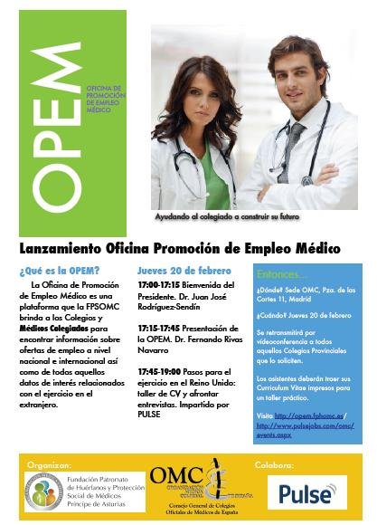 La Oficina de Promoción de Empleo, plataforma que la Fundación para la Protección Social de la Organización Médica Colegial brinda a los Colegios de Médicos y a sus colegiados para encontrar información sobre ofertas de empleo a nivel nacional e internacional así como de todos aquellos datos de interés relacionados con el ejercicio en el extranjero, se presentará el próximo 20 de febrero