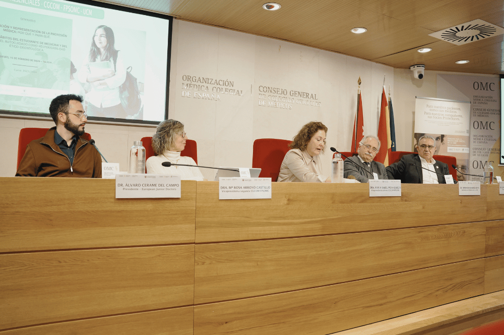 El Consejo General de Colegios Oficiales de Médicos (CGCOM), a través de su Fundación para la Protección Social de la OMC, y la Facultad de Medicina de la Universidad Complutense de Madrid (UCM) han celebrado hoy un seminario para hablar sobre la organización y la representación de la profesión médica en el plano nacional e internacional, así como concienciar sobre la salud y hábitos del estudiante de Medicina y del médico y el autocuidado como responsabilidad ético-deontológica.