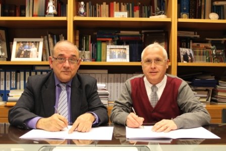 El presidente de la Organización Médica Colegial, Dr. Juan José Rodríguez Sendin y el vicepresidente de la Asociación de Economía de la Salud, Dr. Eusebio J. Castaño, han firmado ayer este convenio en la sede de la corporación médica.
