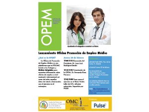 La Oficina de Promoción de Empleo, es una plataforma que la Fundación para la Protección Social de la Organización Médica Colegial (FPSOMC) brinda a los Colegios de Médicos y a sus colegiados para encontrar información sobre ofertas de empleo a nivel nacional e internacional así como de todos aquellos datos de interés relacionados con el ejercicio en el extranjero.