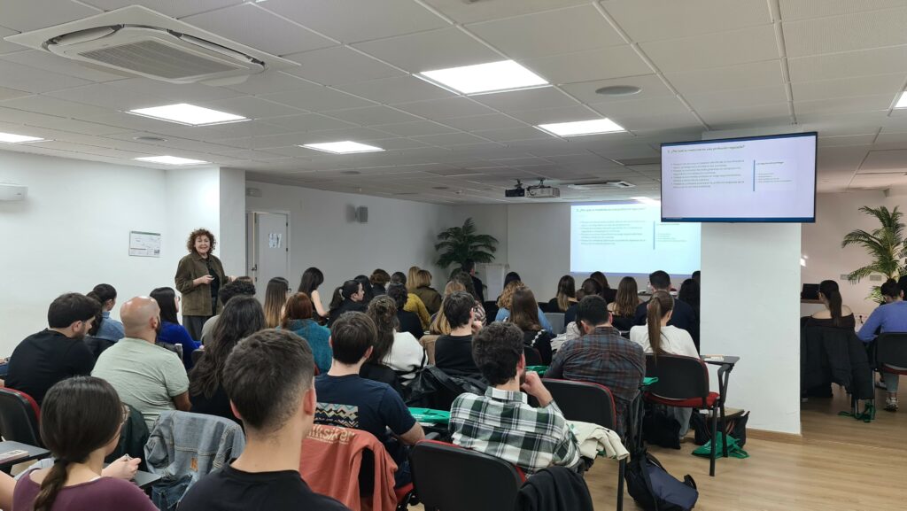 El segundo gran eje del seminario ha sido la salud de quienes cuidan. En un contexto de creciente preocupación por el bienestar emocional en el ámbito sanitario, la Dra. Moya conectó vocación y autocuidado desde la responsabilidad profesional: “la mayoría de vosotros habéis elegido Medicina porque tenéis un profundo sentimiento de vocación por cuidar de los demás, pero para cuidar a los demás, primero hay que cuidarse a uno mismo, sino no estaríamos actuando correctamente”. En este sentido, destacó otro objetivo principal de esta formación: sensibilizar sobre la importancia del cuidado de la salud y la adquisición de hábitos saludables como responsabilidad del estudiante y deber deontológico del médico.