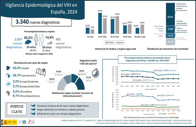 Según el Sistema de Información de nuevos diagnósticos, en 2024 se han notificado en España 3.340 nuevos diagnósticos de VIH, lo que supone una tasa de 6,95 por 100.000 habitantes, aún por encima de la media de los países de la Unión Europea. La mitad de estos casos presentan un diagnóstico tardío. La evolución mantiene una tendencia general descendente, con una reducción más acusada a partir de 2019.